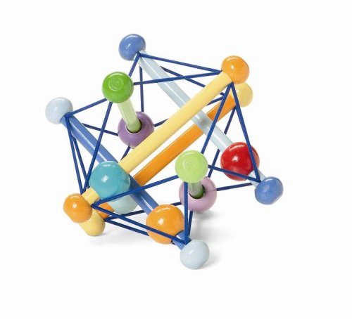 I love the soft swishing sound that the beads make when my baby shakes this and it is really easy for her to hold with her little hands. She loves chewing on the beads and I love that this is completly made of wood so there is none of that PVC controversy.This has been my baby's favorite toy for almost 3 months now (which is almost a record). I don't think any toybox is complete without this.