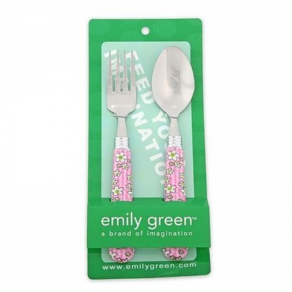 polished stainless steel forks and spoons with funky, retro patterns. brand new to the world of emily green, these special sets of fork and spoon match emily's plates, bowls, tumblers, and imagination mats. each one is 5 ½ inches long, perfect for kids of all ages, and makes mealtime more all-around happy and fun.