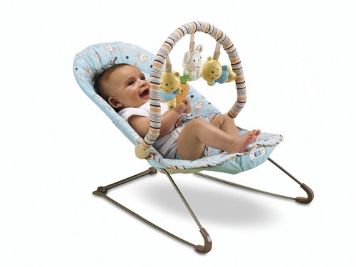 Soothe 'n Play Bouncer gives your little one a comfortable seat and fun toys to play with. The seat features an adorable patterned design and the soft removable toy bar has three dangling plastic toys for baby. The two bears have rattle beads inside and are removable, while the center bunny is a cute cuddly friend with a carrot that dangles for fun bat-at play. Includes gentle vibrations to soothe baby. Measures 17" x 18.5" x 3.5".